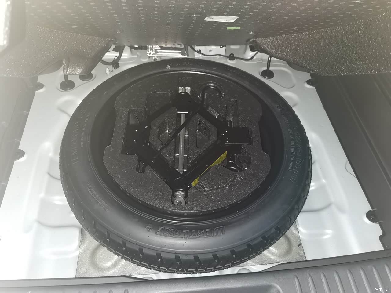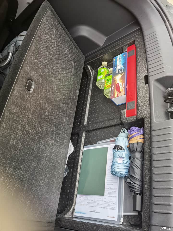 对于一个车长只有四米四的紧凑型SUV来说,这个后备箱空间我还是比较满意的,日常出行和全家出游都足够用了,隔板底下还可以放一些零碎的小物件,包括我的灭火器和三脚架,做一些小型收纳还是很棒的。泡沫板拿起来之后,底下是一个非全尺寸备胎。