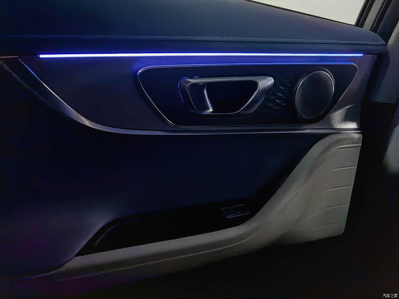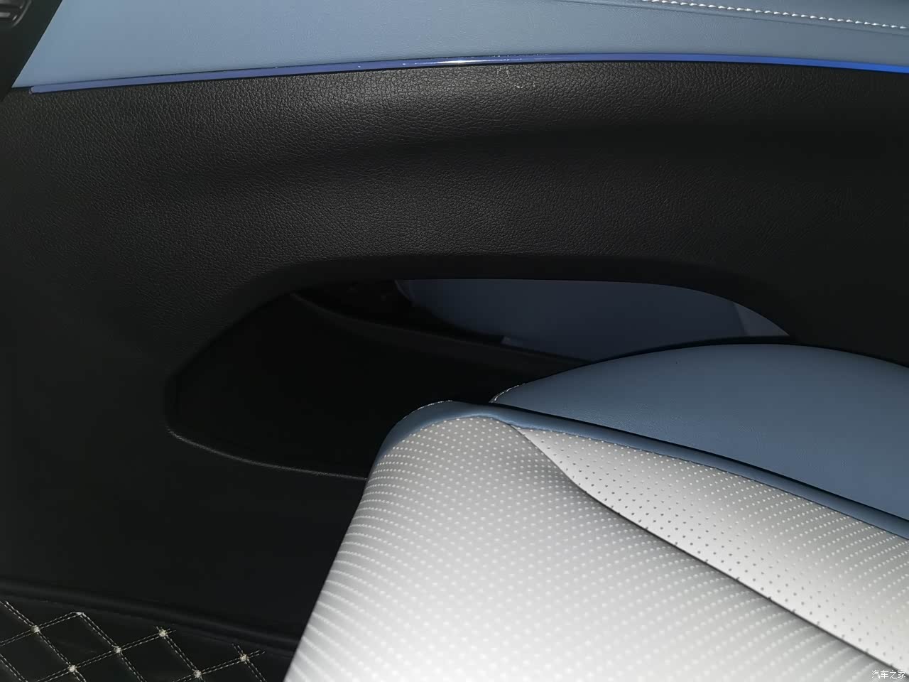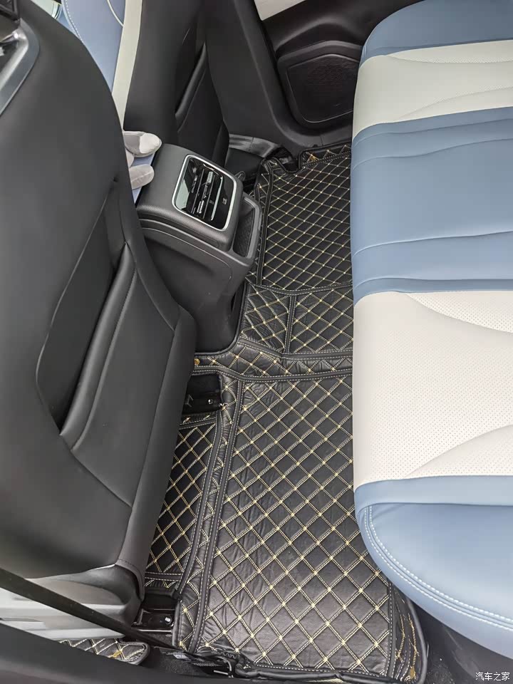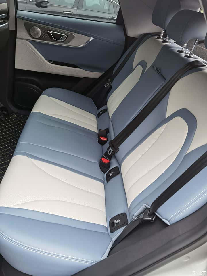 第二排的空间也足够日常使用,手能摸到的地方都是软质皮革包裹,摸上去手感非常舒服,后排的地台近乎纯平,哪怕是坐在中间也不会有局促感,中央的扶手还可以放下来作为杯架。