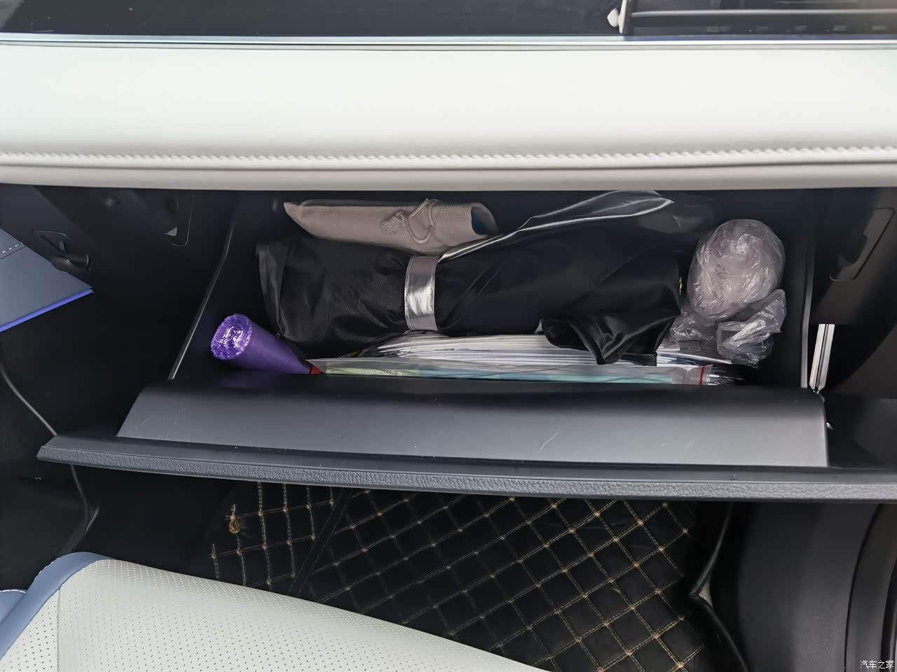 必须要夸一夸这个中控台下面的储物格的设计,非常巧妙贴心,可以说把可用空间发挥到了极致。日常可以用来放包包或者是平底鞋。副驾驶的前方有一个储物抽屉,用来放一些备用的口罩,遮阳伞等等都非常方便。