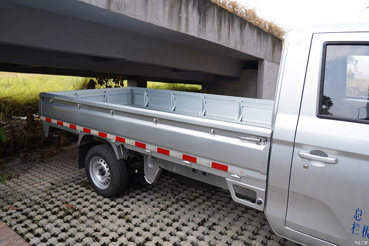 空间分两个部分讲一下。第一,装货空间很好很完美,货箱长3.3米,宽1.66米,栏板高度38厘米,长度和其他品牌这个类型的车基本一样,但是要宽出不少,而且栏板高,两边都有绳钩,装货很好固定,放的东西也更多一点。第二,车内乘坐空间,这车别看货箱占了很大比例,车内设计出来的空间也很好,两个人坐进去一点也不拥挤,头部腿部都很轻松自在。
