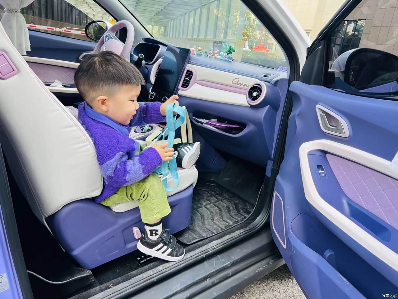 车辆外观采用魅惑紫色,A柱和车顶采用了白色配色,轮圈装饰罩也加入了淡紫色的点缀,整个车大胆的撞色设计,一眼就能让人深陷其的颜值中。而且车身后方C柱上还有专属的Charme标志,据说是法语里魅的翻译词哦。