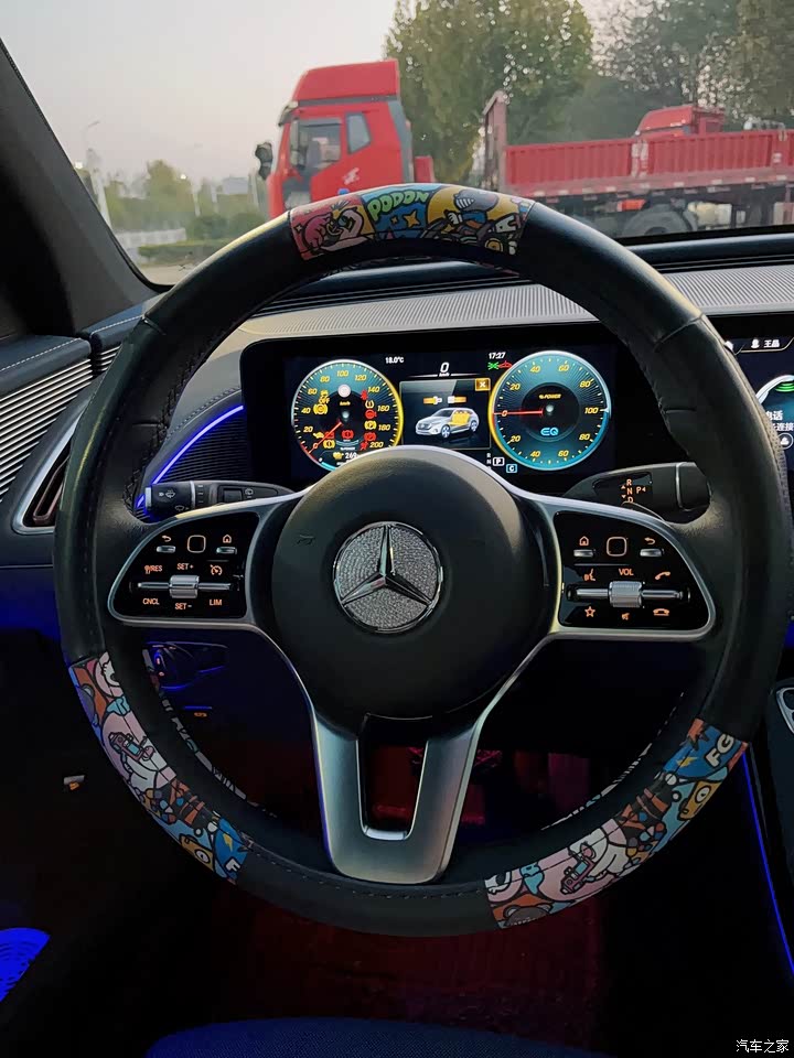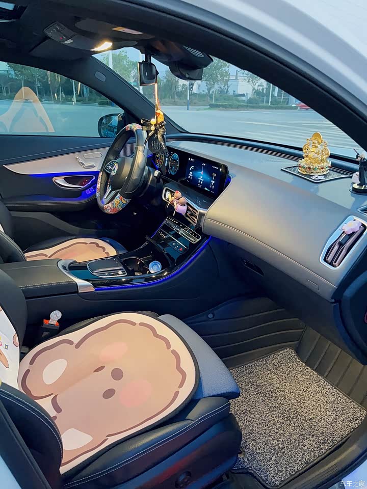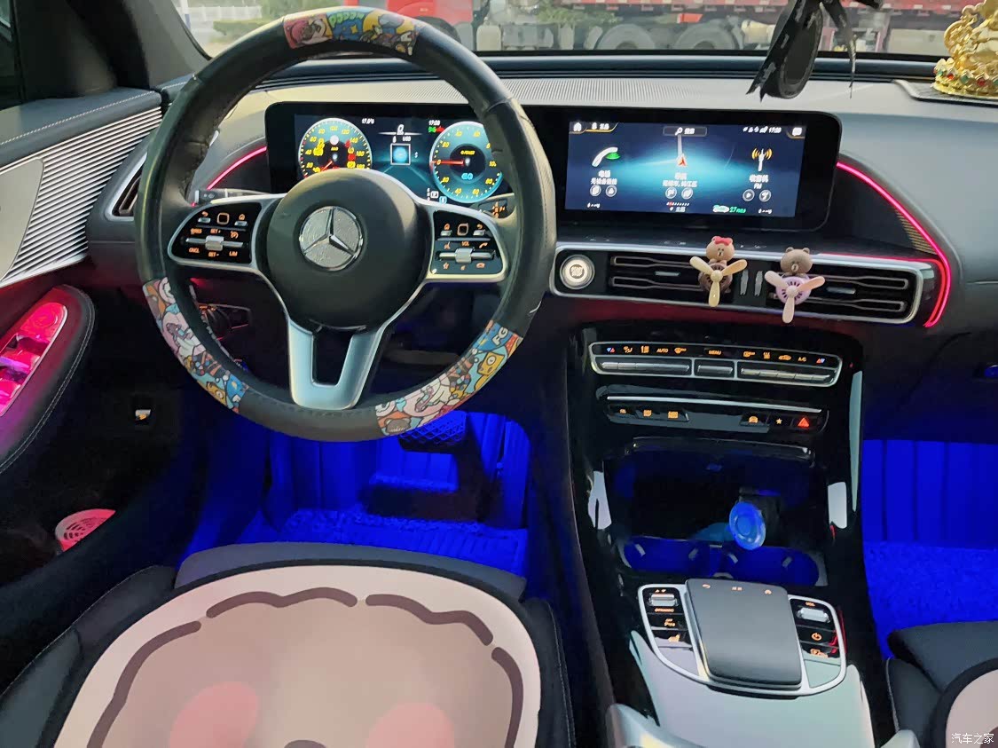 内饰方面,总体感觉还行,双联屏设计,看着很 舒服,并且清晰度很高,而且有 4种主题模式可以选择,每个主题都有自己的风格特色,中控台采用的蓝黑色搭配,看着很舒服,座椅也是蓝黑色的很好看(俗称游艇蓝)奔驰EQC还有奔驰独有的64色氛围灯,夜晚开车,里面有种KTV的氛围,我估计小姐姐们很多买奔驰的都是冲这个的!