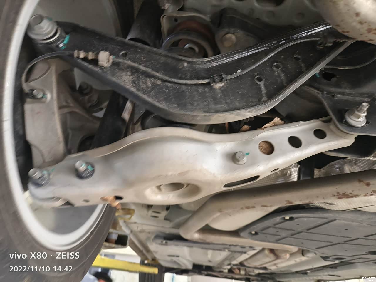 去保养的时候随手拍了这车发动机舱和底盘照片,这车配置确实不错,后轮多连杆式独立悬挂材质杠杠的,我特异用手一个一个摸了摸,别克车身重是有原因的,材质用料确实好,不管是内饰也好,还是底盘悬挂也好,确实比较用心。