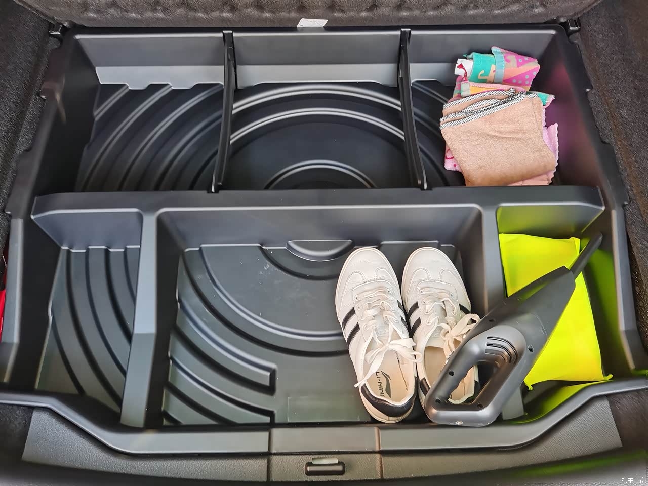 悬浮式档把下方做成了镂空的,可以放些纸巾或手机之类的。四门储物格都挺大,完全可以放上雨伞或大容量水杯。为了达到后排放倒后与后备箱整体平面的设计,备胎上方增加了储物格以提升后背箱高度。