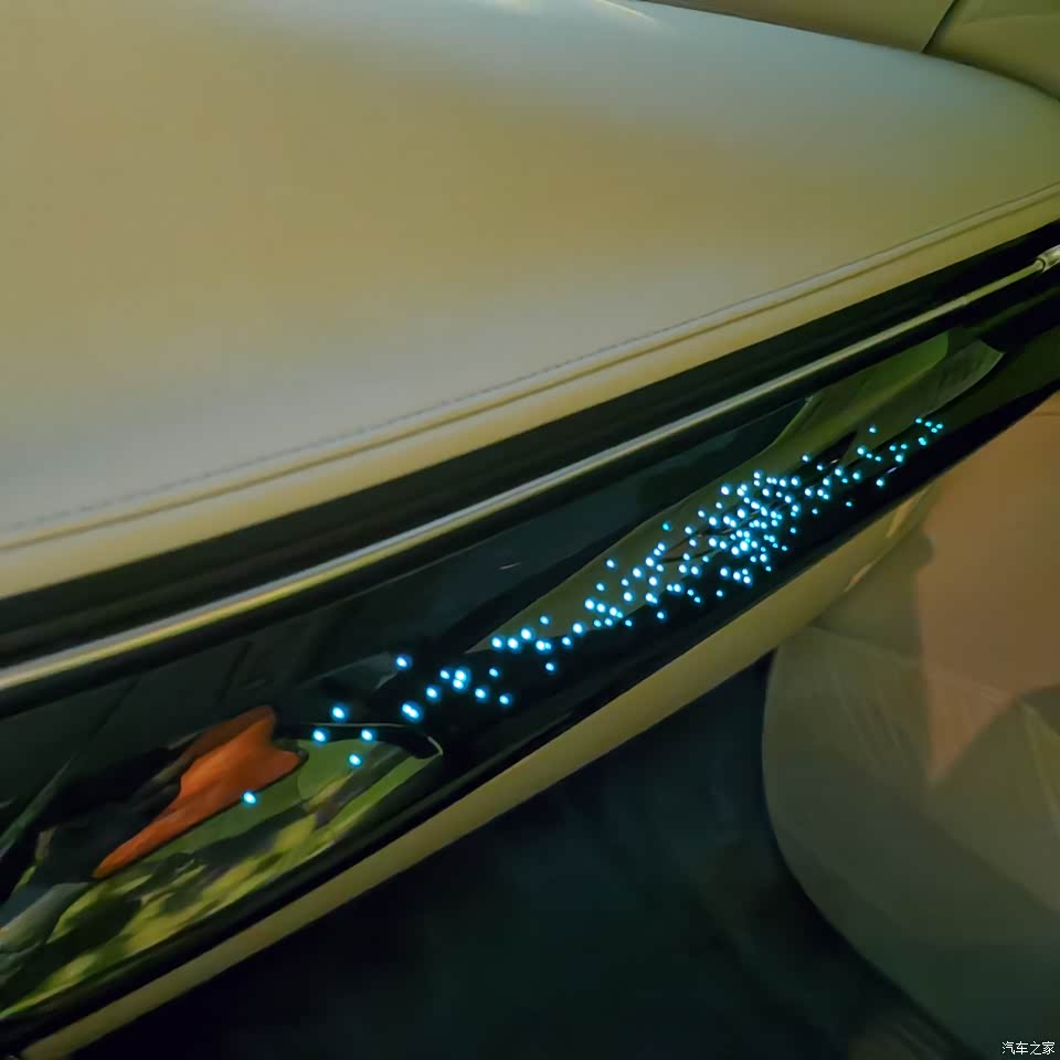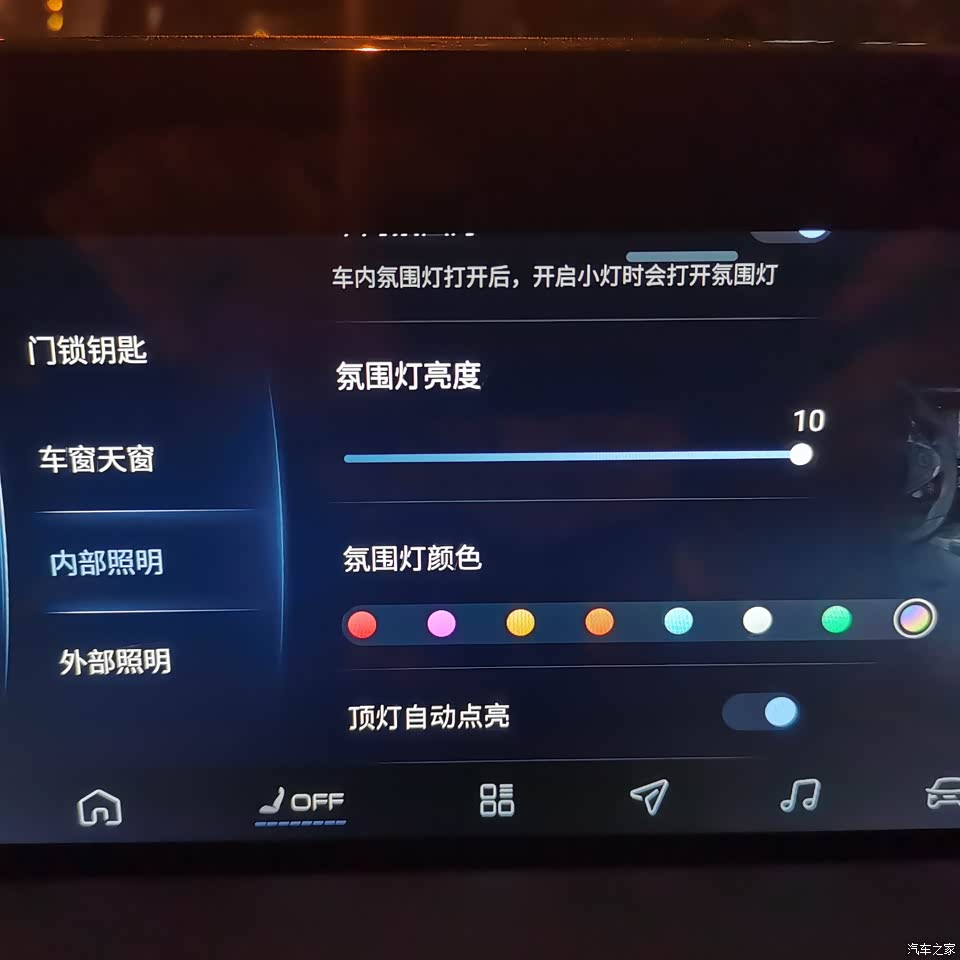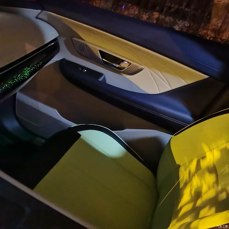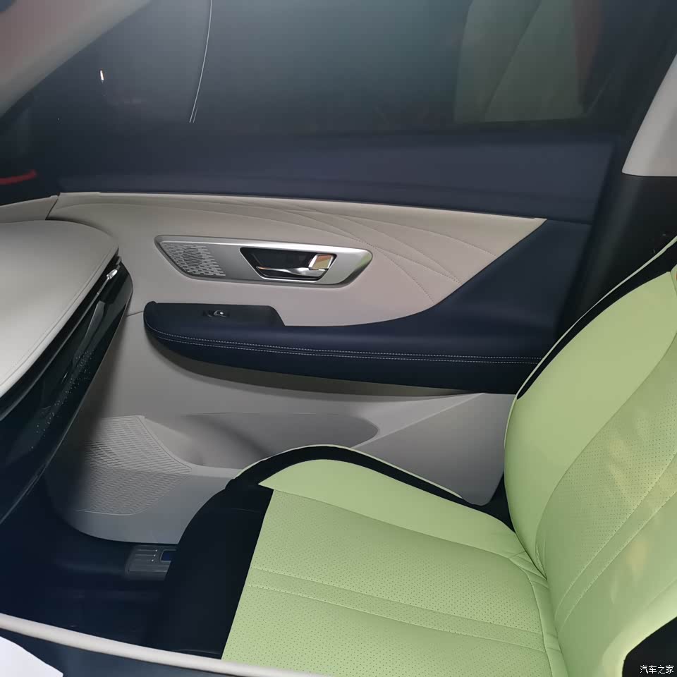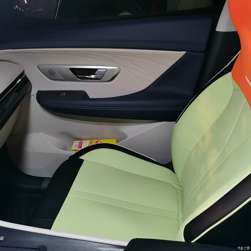 内饰我选的蓝白的,怎么说呢,黑色内饰总感觉颜色太单调了,蓝白的看着舒服点,提车后我又怕把座椅弄脏了,买了个皓极专用黑绿座椅套,套上感觉比选配色更顺眼了,非常喜欢😍,车自带的氛围灯不断变化的,挺好看的,有10挡调节,各种颜色任选的