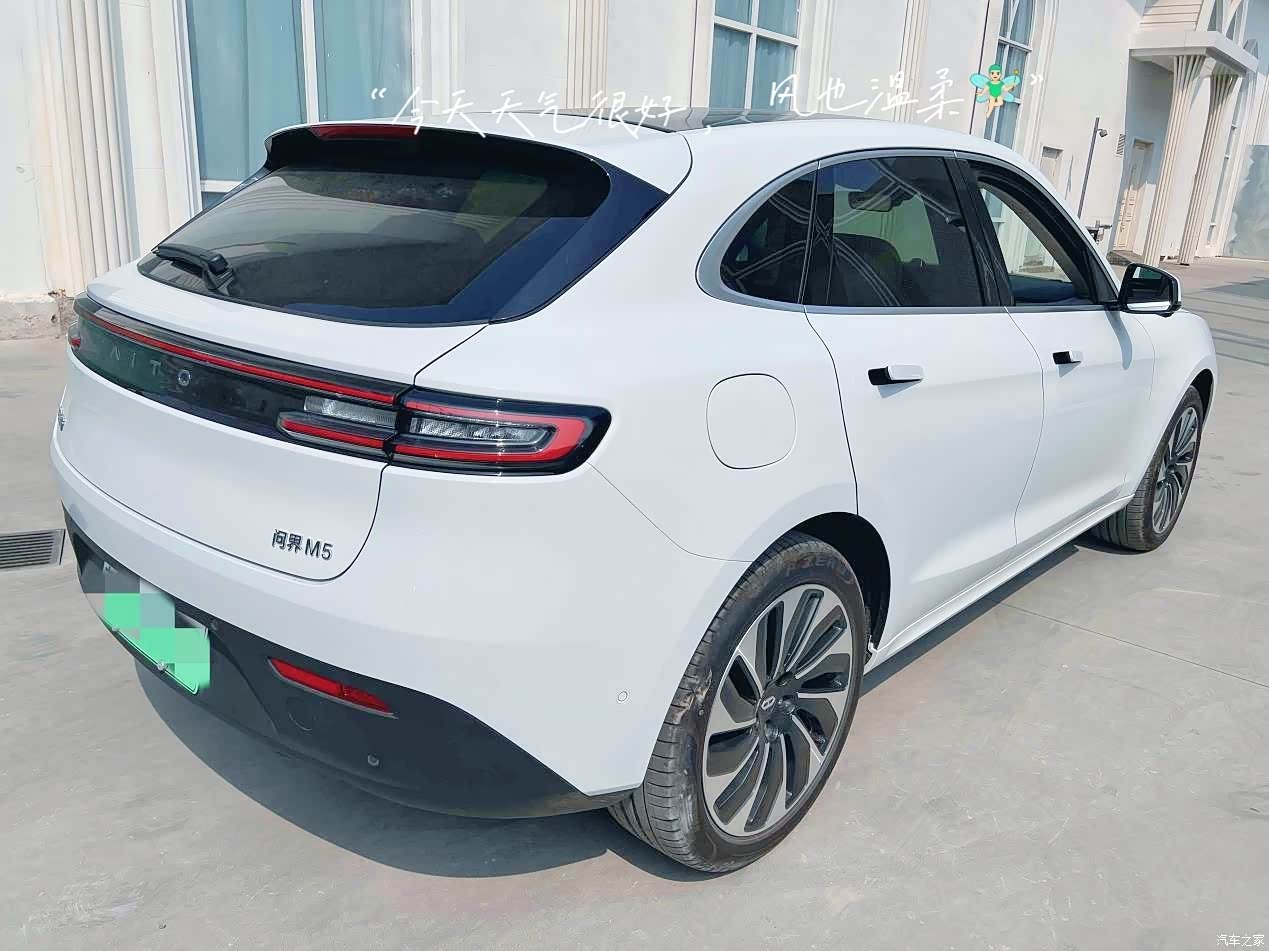 至于价格方面,问界M5也算的上是比较良心和厚道。它的价格没有超出我的预期,算了一下能给到的功能和配置,它还是挺良心的。看车的时候店里面的工作人员服务态度挺好的,跑前跑后的跟随介绍各个不同款式的车型价格以及配置差异,而且还帮助我分析了利弊。提车成功以后,店里面还送了我一大堆赠品,隔热膜是我的最爱,虽然天幕本来就有隔热隔绝紫外线的功能,不过加一层隔热膜总觉得效果更好。