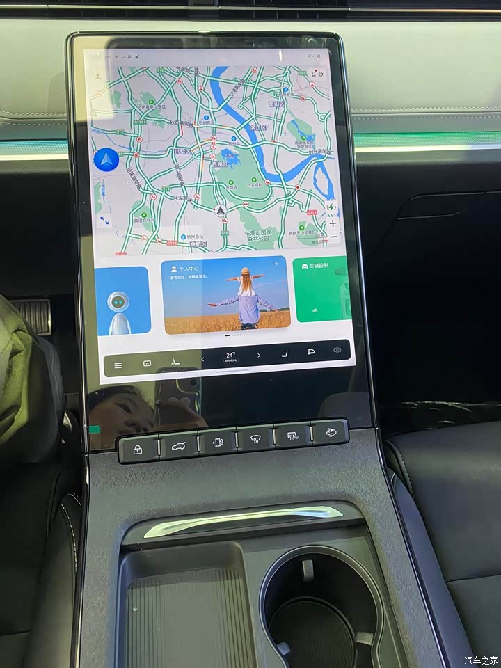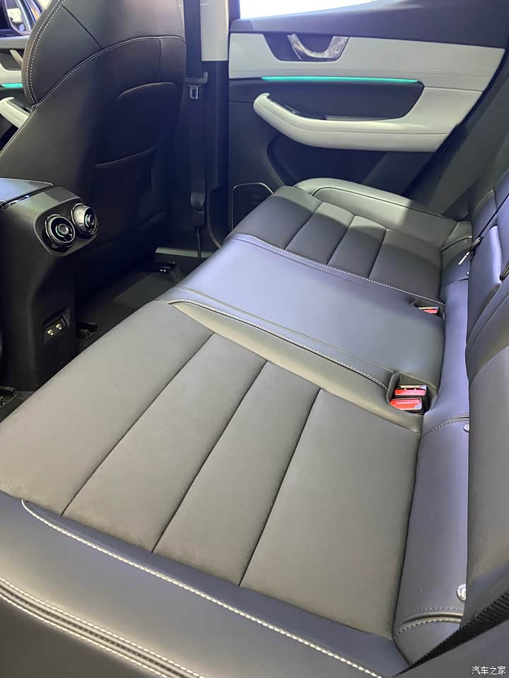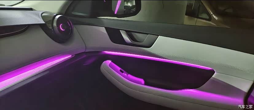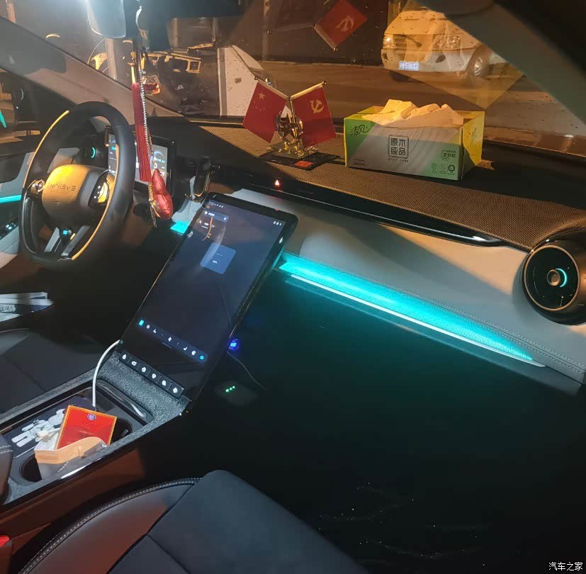 内饰配有氛围灯,整体的档次看起来还不错,空调出风口都带有氛围灯。还配有一个超大的屏幕,加超大的全景天幕