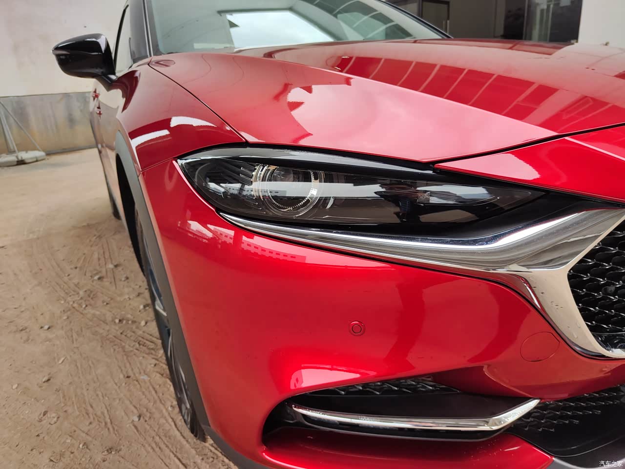 从前脸车头看的话,比较硬朗,也挺霸气的,对于女生来说安全感还是满满的。就是这个匠涂工艺的水晶魂动红好是好,非常漂亮,就是价格贵了点,比其他颜色多了3000元。为了自己的喜欢,也就只能多掏点了呗。LED的大灯感觉特点一般一般,但是整体看来还是非常和谐的。都说是轿跑SUV,很是名副其实的。