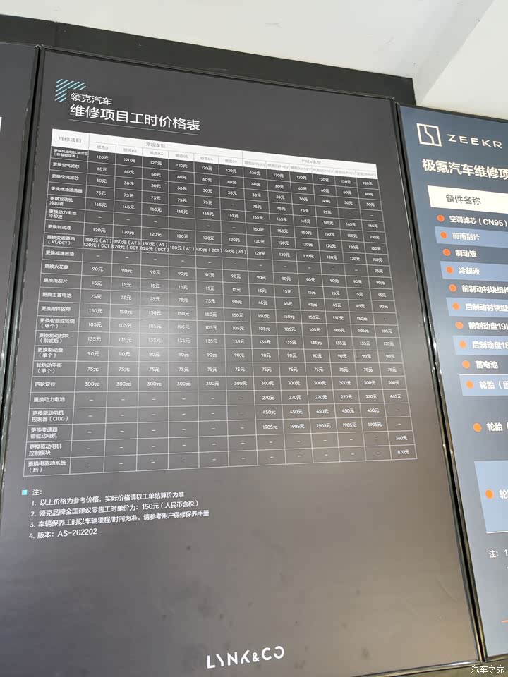 领克官方把保养周期调整为15000公里或者1年,对于我这种每年3万公里的选手,还是可以省点保养费用的,emp远航版上市后,针对老车主还加送了10次保养,估计前面8年都可以免费换机油了,给领克点赞,后面自费保养估计1000多块一次吧,暂时还没有自费的机会。下图是拍摄的4s维修保养价格表,供车友们参考。
