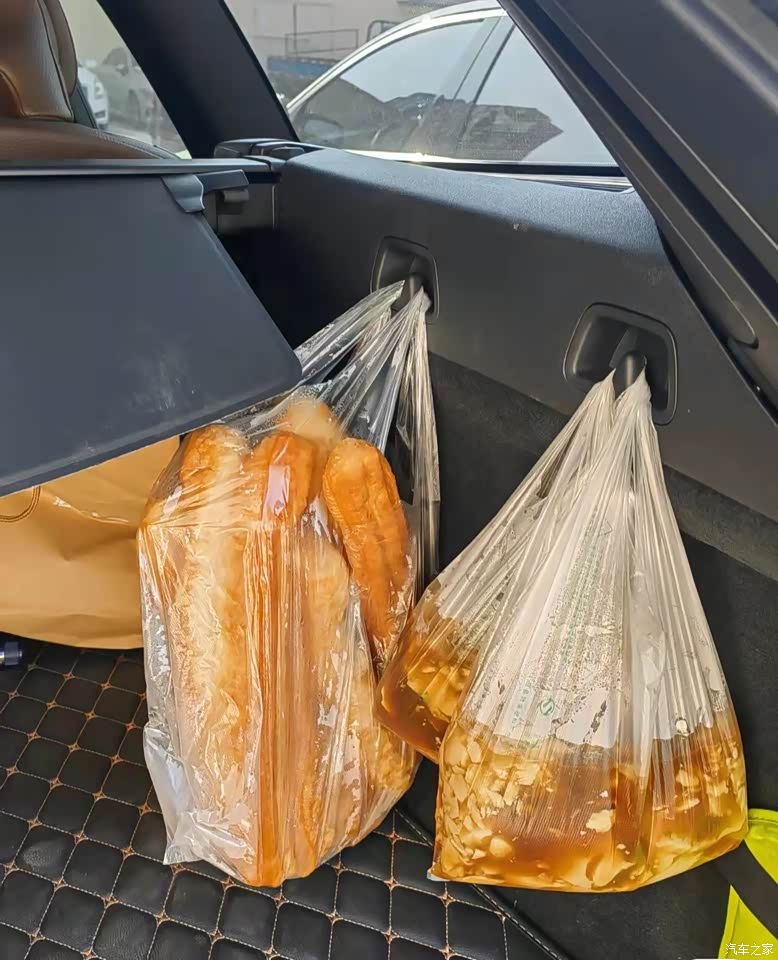 后排B柱、车顶和后备箱的挂钩设计比较贴心,挂些汤汤水水,增色不少。