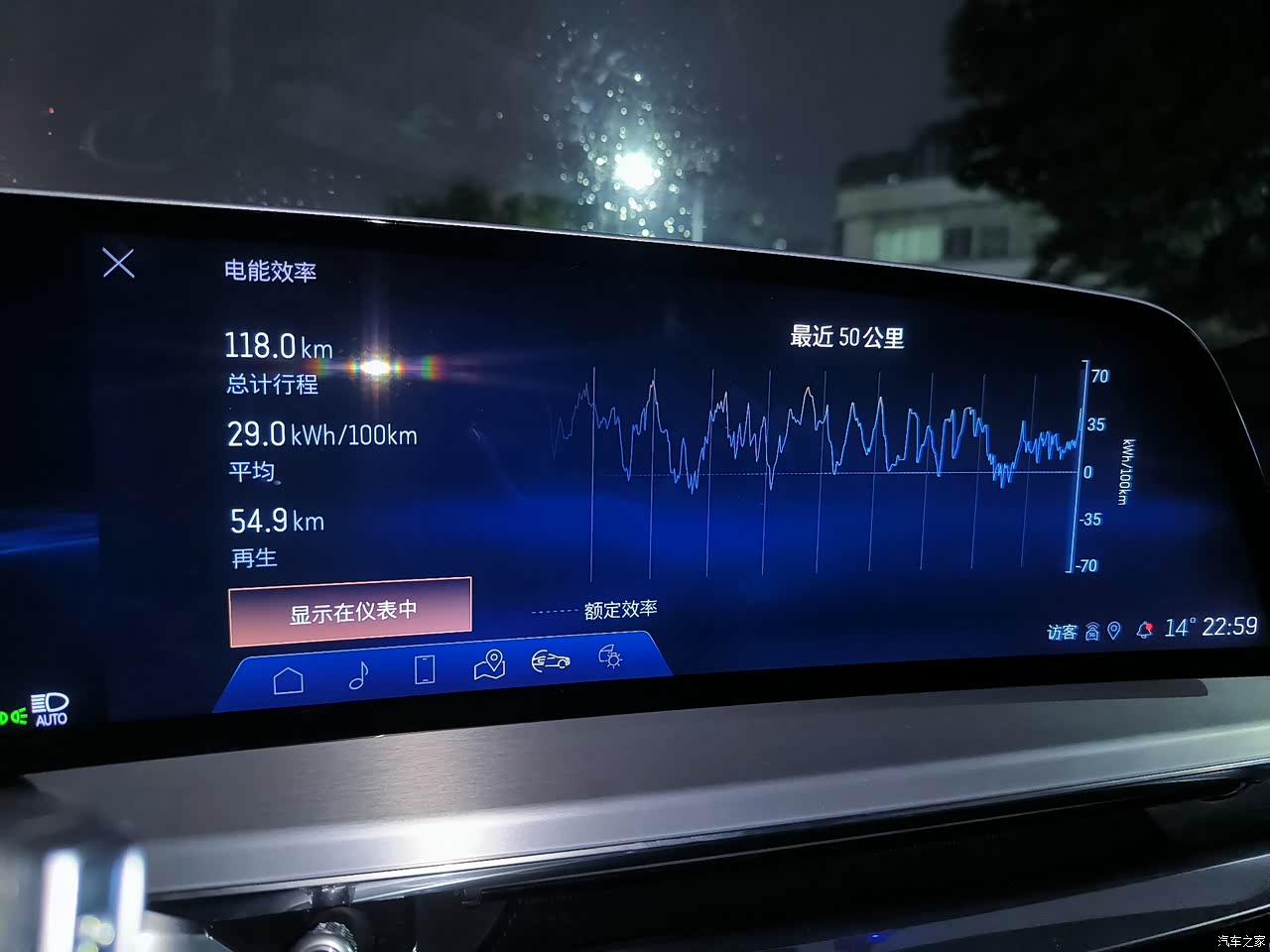 燃油车看重的是油耗,电动车的续航就也是很重要的了。据我了解,这台车电池总共96.6度。在冬天的情况下(这边最近是6°-10°+大雨)。空调开26度自动,跑下来能耗显示是每百公里30度。暖气和下大雨的影响还是很明显的,平时如果不下雨的话,一般开暖气能耗也就是每百公里25-26度左右。 刚提车那段时间天气热,不用开暖气,开空调的能耗基本在每百公里20-23度左右。