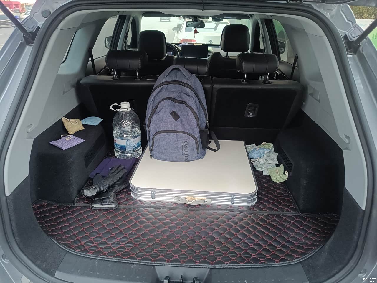 后备箱很大,完全足够,平时露营需要的储物空间。唯一不舒服的一点就是两边的隆起。销售说这个模具是7座的模具,这个位置是7座放水杯的地方,5座下面是空的,如果能把这个去掉就更舒服了。
