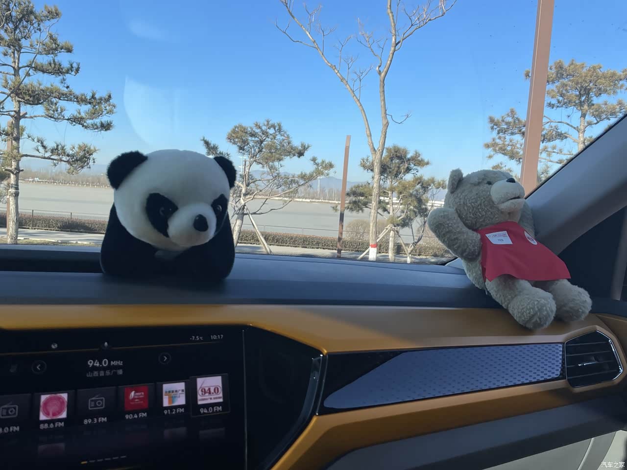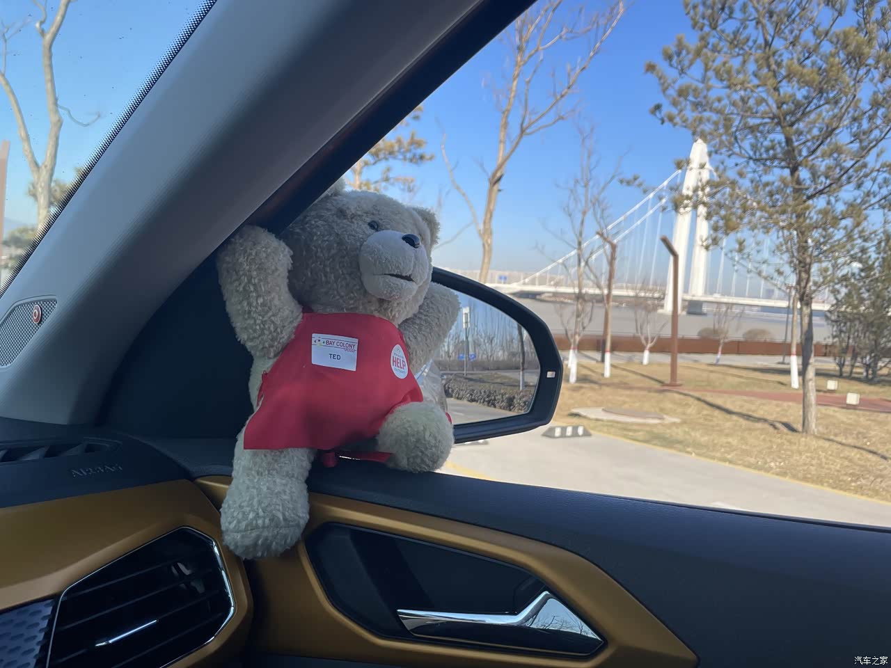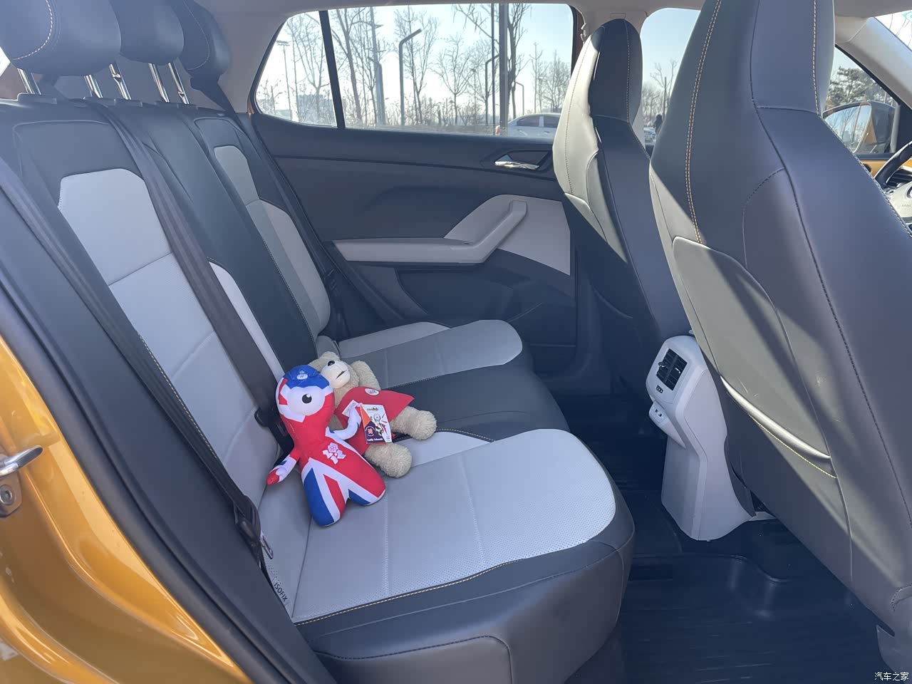 在我看来,整体内饰是比较优雅的,看上去十分简单,却又比较耐看。方向盘是塑料的,比较粗糙,仪表盘看上去是比较时尚的感觉,织物的座椅观感还是很不错的,进一步提高车内的质感座椅比较厚实,坐上去还算舒服,包裹性也不错,能很好的把屁股包裹住。总结整体的布局比较简洁,很耐看。(为了拍照美观也是为难我的俩玩偶了)