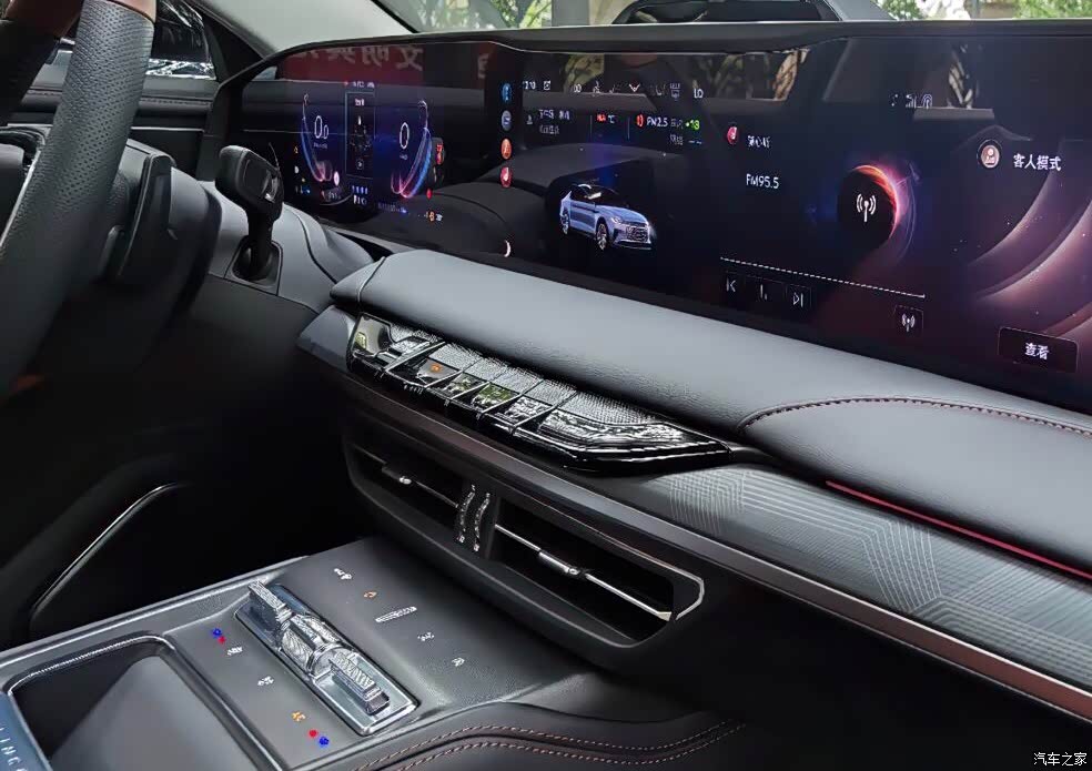 车内的大连屏真的很酷,用一整个大屏看导航真的很绝,大屏的清晰度是4k的,还是很清楚的。换挡时按键式换挡,格调很高,就是刚开始开这辆车的时候不是很习惯,目前适应了一段时间之后就觉得很方便。