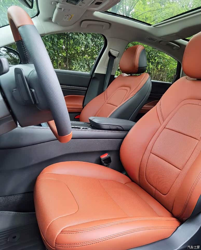 内饰方面质感还是非常不错的,像基本手能触碰到的地方都是真皮包裹的,而且车里面是没有多大的异味的,大屏的清晰度包括流畅度都是不错的。