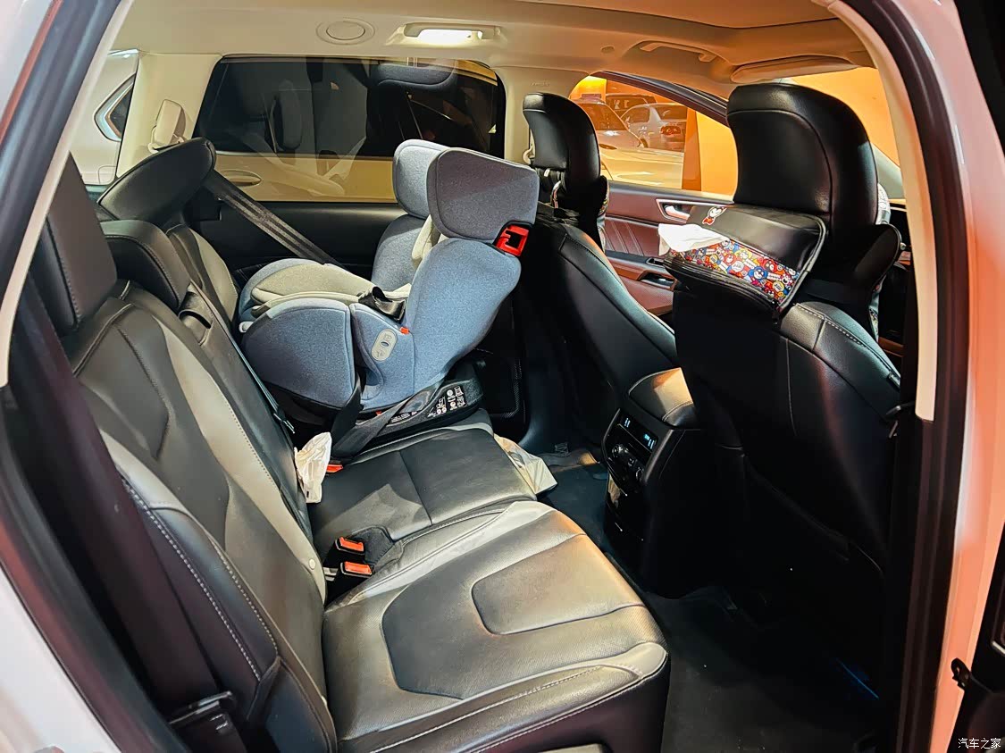 第二排乘坐时腿部空间还是比较充裕的,腿离前排座椅靠背大概有两拳距离。中央地台虽有凸起,但几乎是纯平状态。中间乘坐时,双脚不会觉得无处安放。就算安装了儿童座椅,旁边也是可以乘坐两人,并不会觉得拥挤。
