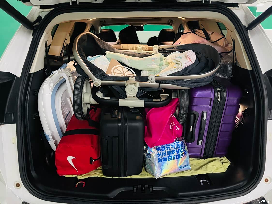 第三排放倒的情况下,空间装载能力还是很不错的,同时可放下两个28寸行李箱,两个26寸行李箱,还能放下一辆婴儿车。