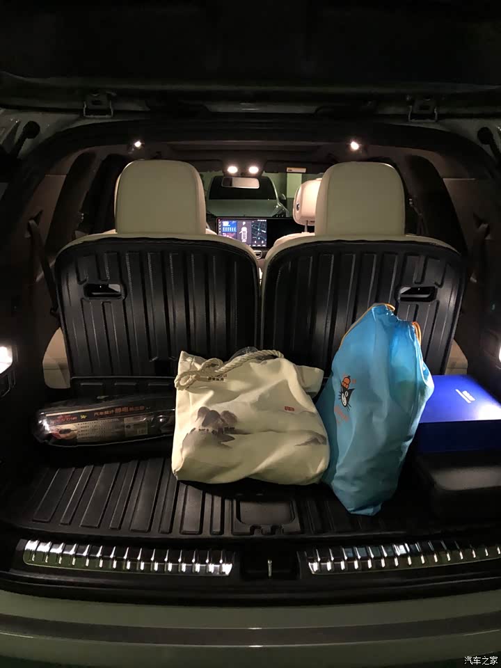 日常够用了,放2个行李箱没问题,另外第三排是支持一键电动放倒的,很方便,容积大大扩展。