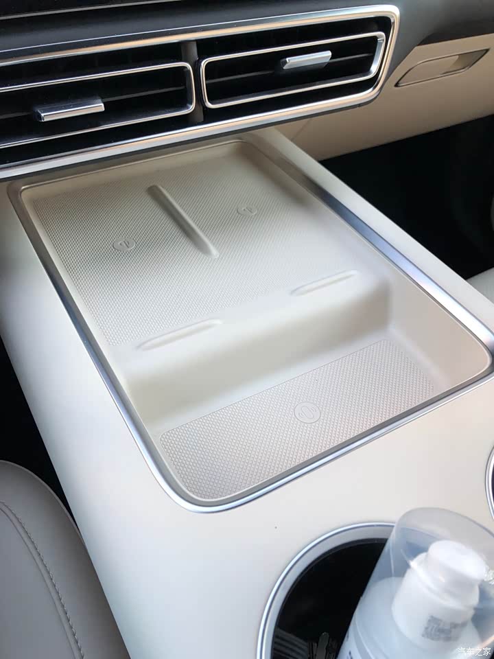 理想L8采用了怀挡设计很方便,中控台下方这里设计为放手机的位置,同时带无线充电功能。