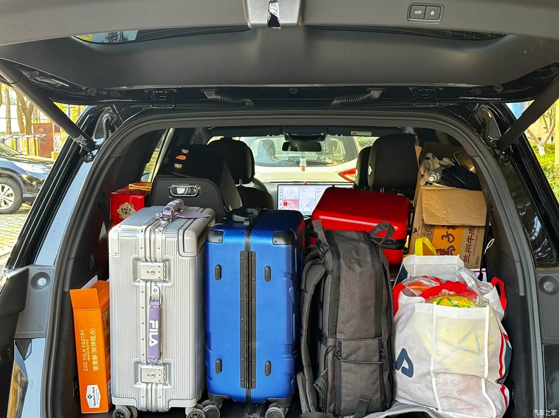 放倒三排座椅,后备箱空间巨大,六人满载时,至少能放下两个登机箱再加一个双肩包,日常够用。