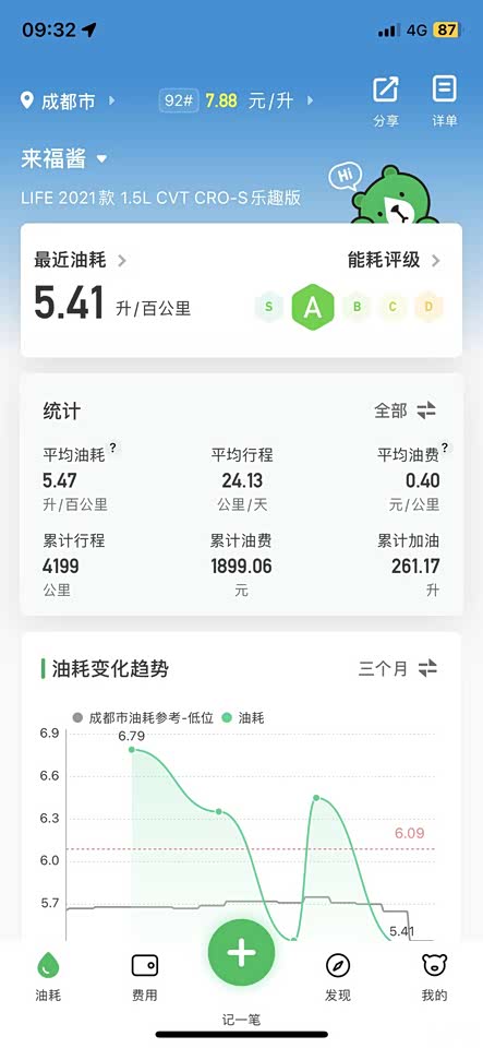 油耗表现非常满意,车子主要是每天上下班通勤代步,城市道路为主偶尔休息时出去跑跑,目前综合油耗6升左右,加200块钱的92号汽油可以行驶500多公里。