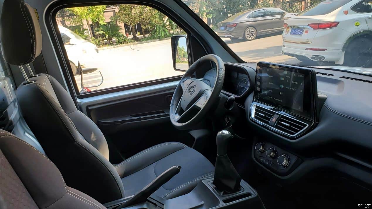 内饰用料感觉一般,大多都是塑料材质,中控台有一块彩色中控屏,这个设计在货车上还是不常见,液晶显示屏,可显示水温、油量、里程等信息。座椅支持靠背调节,累的话可以放平,然后平躺在座椅上休息一会,这样跑长途的时候不会特别的疲惫。