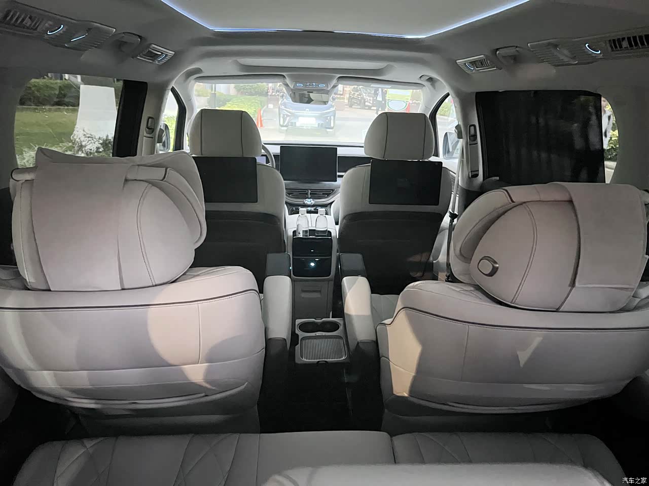 这款车子是七座的,前后分了三排,每排座椅之间的间距设计宽,车顶做的高,坐在上面丝毫没有压抑感,宽松舒适。而且中间这排也是独立的座椅,坐在上面蛮舒服的。车内储物空间设计合理,存放点随身用品方便。后排座椅也可以放倒,后备箱的空间够用的。