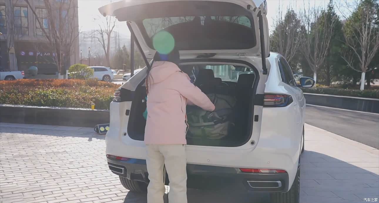 空间真的非常充足了,暂且不说车内的乘坐空间,我们就看后备箱都能被它这大空间震惊到,平时我跟我老婆开车上班,也就两个人坐前排,位置宽敞得很,脚也都可以伸直。周末的时候我们偶尔是会到城郊约个会露个营什么的,一般带点帐篷啊烧烤架这些后备箱的空间都还是很充裕。不多说,直接放一张我老婆跟后备箱的对比照你们就知道了。