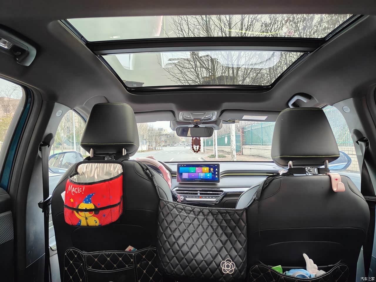 内饰颜色我选择的是黑绿色。基本都是黑色,搭配上一点绿点的边,这样比较耐脏。赤兔还有个全景大天窗,这样车里的采光就不用担心。不仅车里亮度高,还利于通风。 我的座椅材质是翻毛皮,看起来高档,摸起来舒适。就是不好打理卫生,相比来说,皮质的更加好清理。所以我长期在座椅上安装垫子。 赤兔的铂金版内置行车记录仪,而且还是内外双摄。清晰度很高,满足日常使用了。