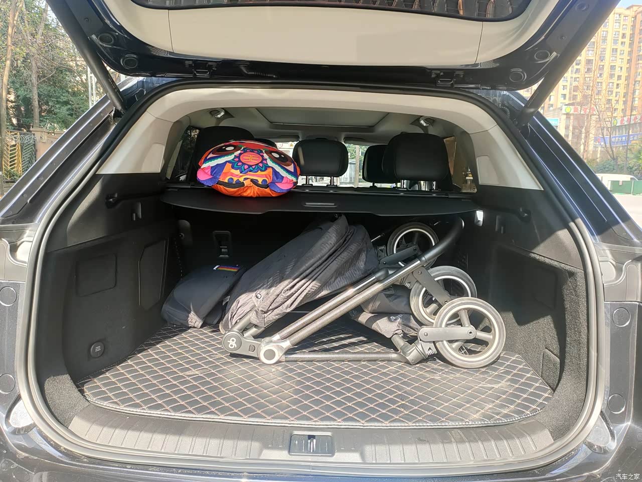 后备箱空间也足够大,家用足够,放下一个较大的折叠婴儿车(goodboy),余量还很宽敞 ,另外后备箱垫子下还有一块扁平的空间高度十公分左右,适合放些小东西。