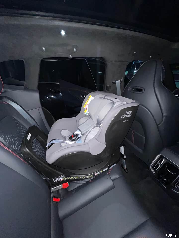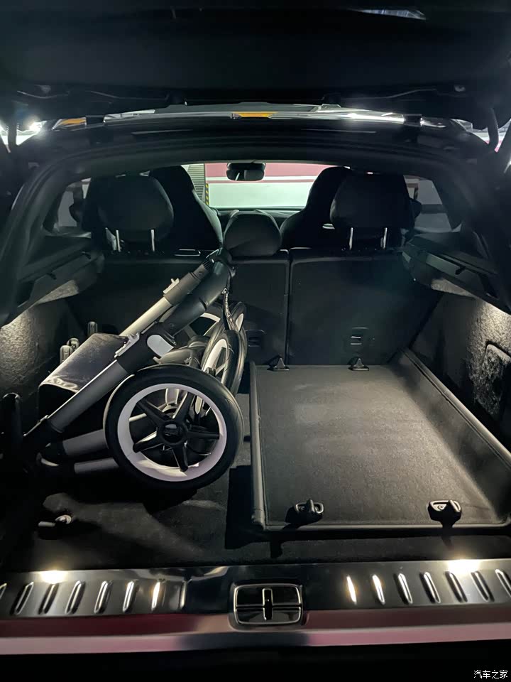 前面有高度中置的发动机,后面有造型奇葩的尾门和后门线条,勉强和GLE一个乘坐空间。放下两个婴儿座椅中间没有空间了,前仓因为内饰包裹性好,空间也不大。
