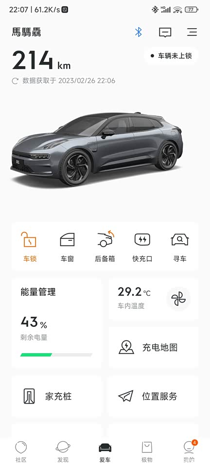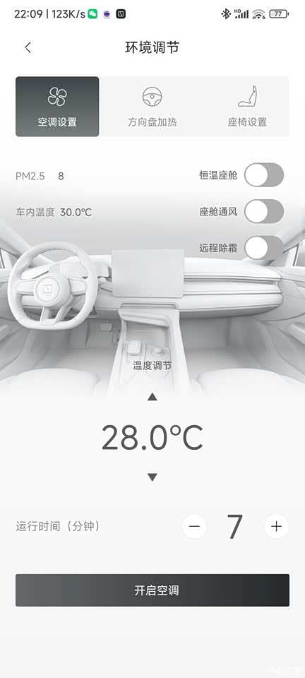 手机APP能远程解开关车锁、车窗、后备箱、快充口、找车等功能,支持远程开启空调、除霜、座椅通风加热、方向盘加热等功能。