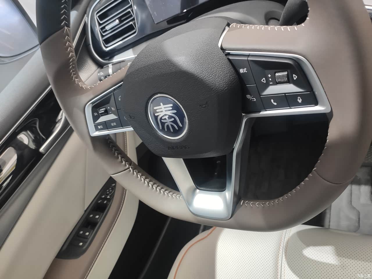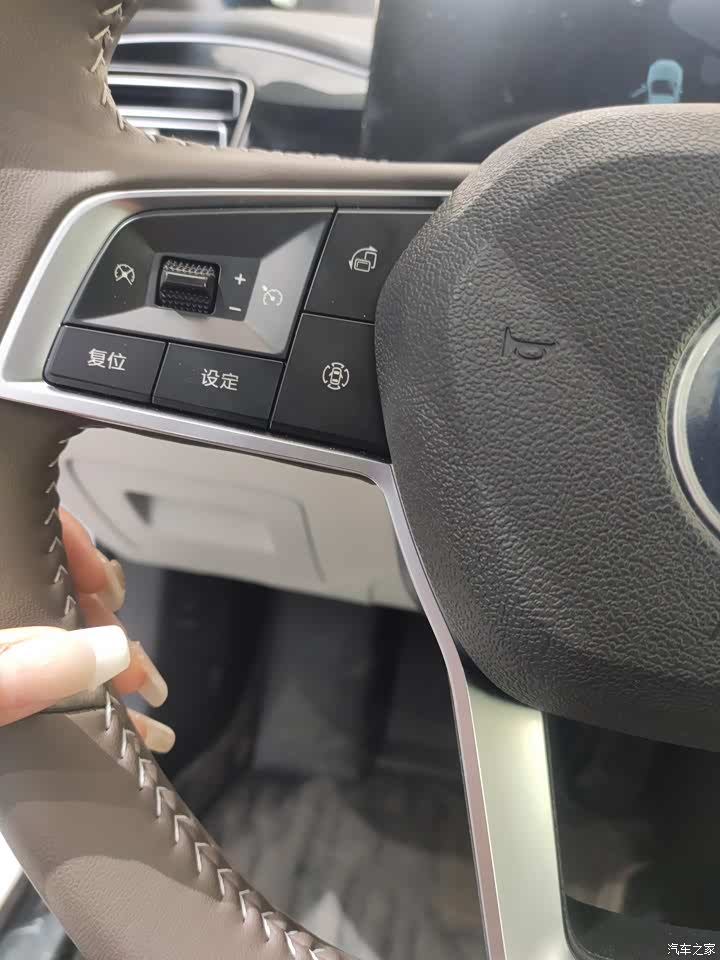 方向盘也是拼接运动风格,很轻,女生开也很适合。