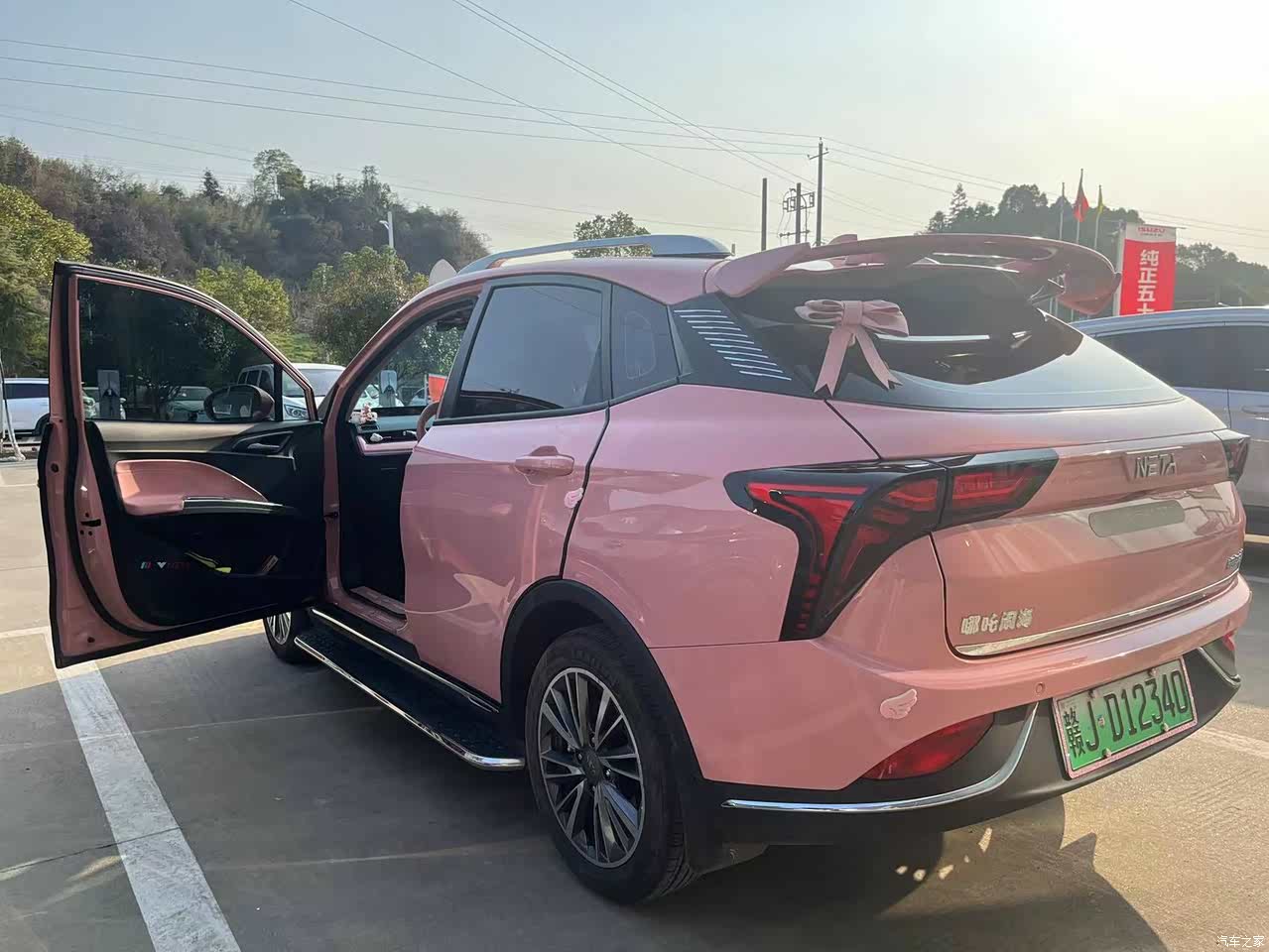 外观必须是最满意的地方,第一次就是看中路哪吒V的粉嫩外表,不需要改装就可以是粉红色的,应该没有哪一个小姐姐可以拒绝一台粉色的小车车吧,我还增加了改装,增加了行李架、侧踏板、还有尾翼,这些都是配合这个粉色的萌萌的外观来做的,尾翼是自己找的喷漆店给喷漆,为了和整车颜色相呼应。