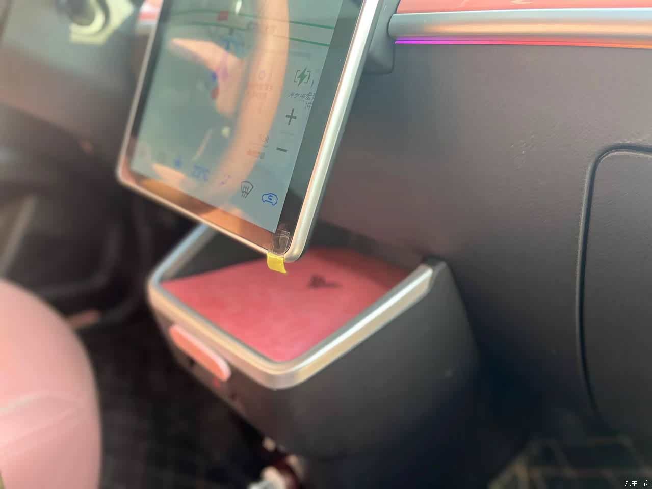 内饰整体也是粉红色,有一个比较大的屏幕,使用起来就像大的手机一样,语音唤醒也比较流畅。之前在网上有人看到说新能源车型会出现黑屏之类的问题,目前暂时还没有出现。