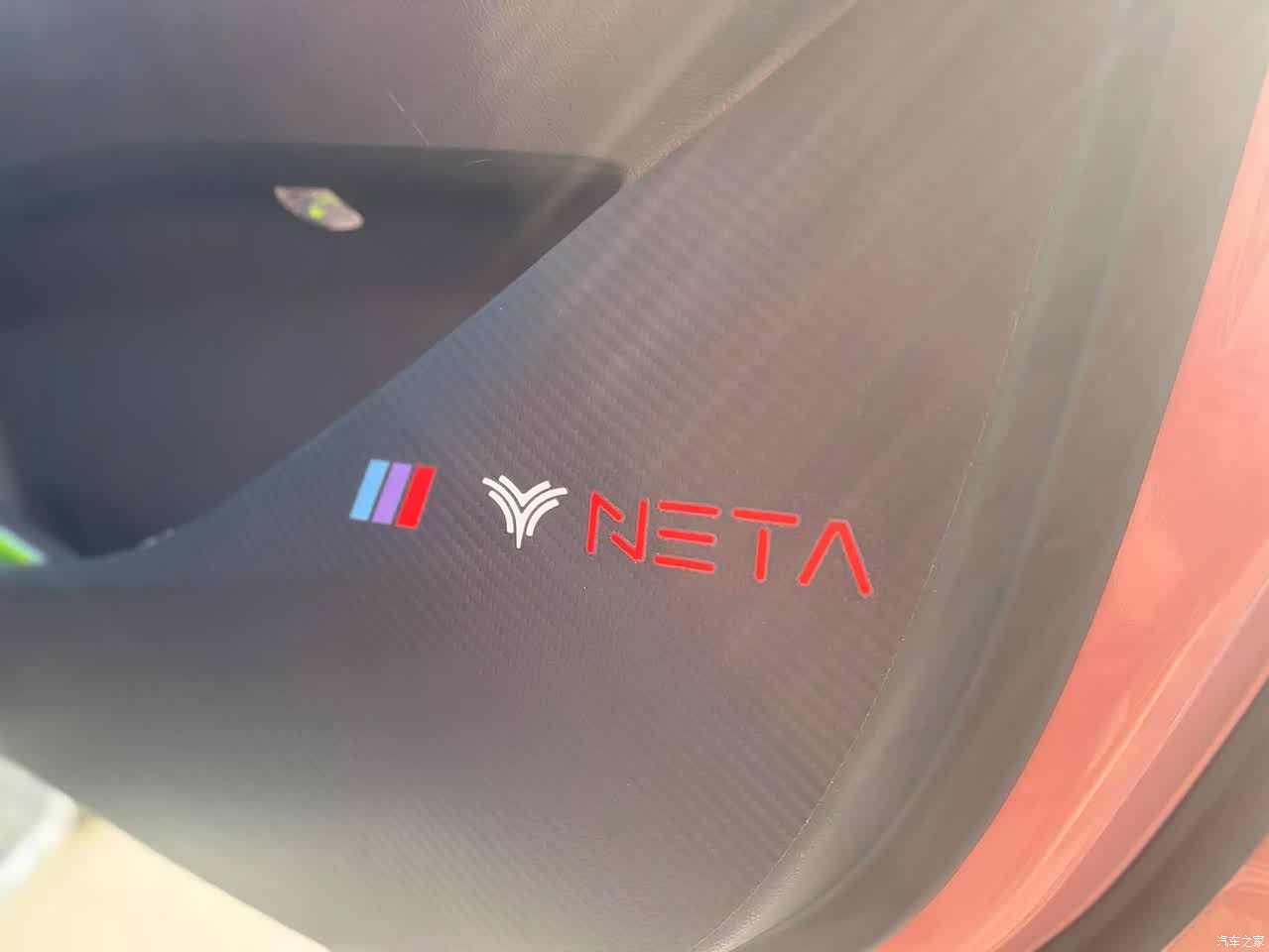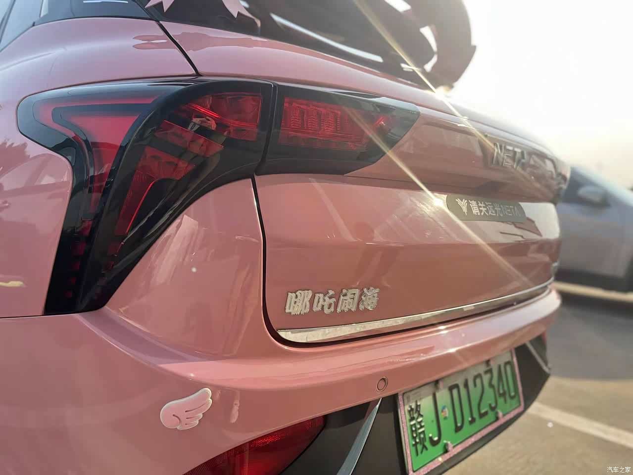 选择哪吒汽车的logo贴纸、贴在车门侧方