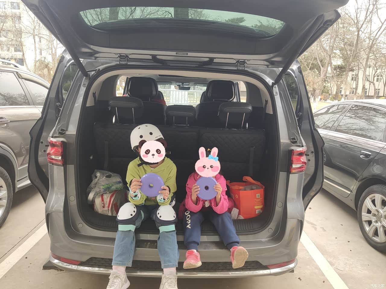 后备箱并不大,不放东西正好可以坐下两个小朋友。