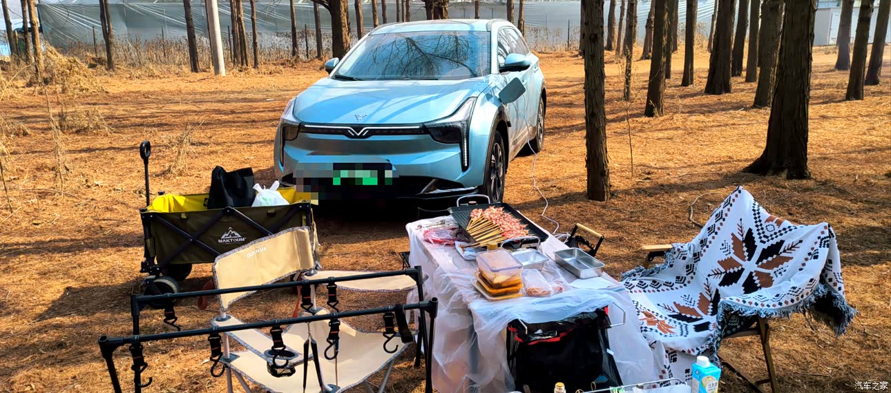 露营时拍的照片,哪吒U的慢充口在驾驶员侧,正在放电。