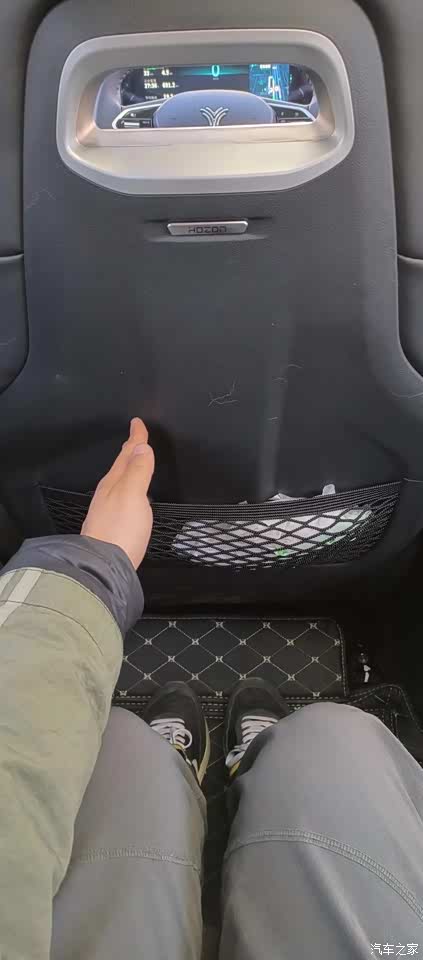 后排的腿部空间:前排调整至符合我的驾驶位时,后排大概3拳有余,立着放个27寸行李箱没有问题。