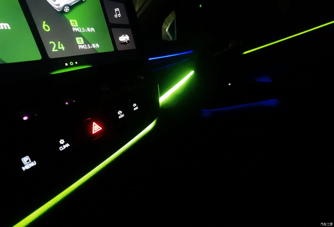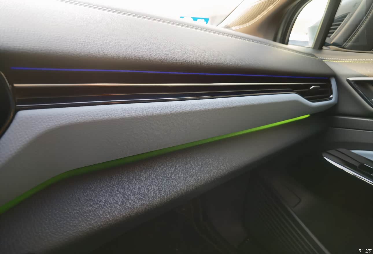 氛围灯支持五种主题30色可调,中控台和两个前门分两层显示,中控车机也会根据氛围灯的颜色改变底色。 不好的是后排车门居然没有氛围灯,差评!