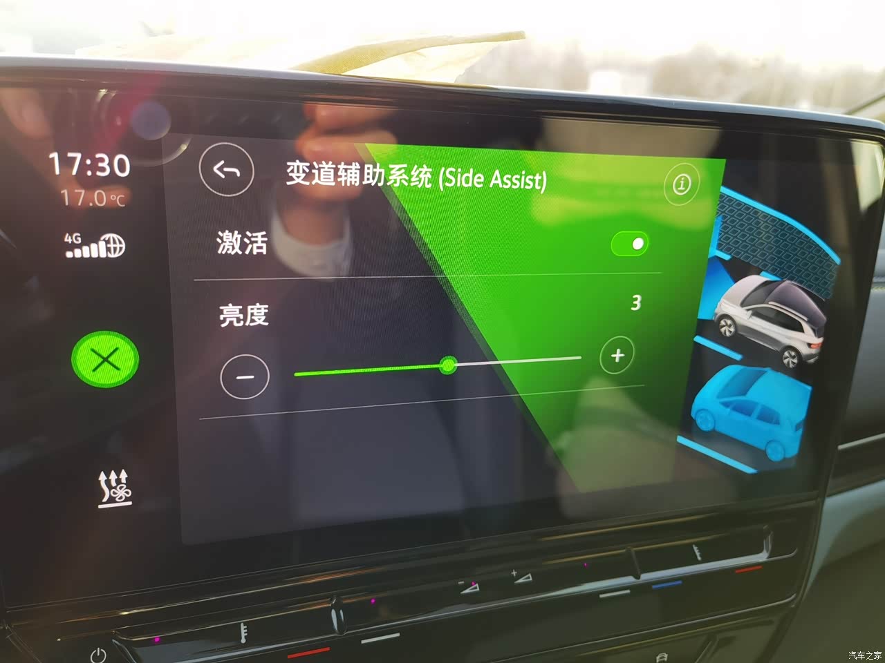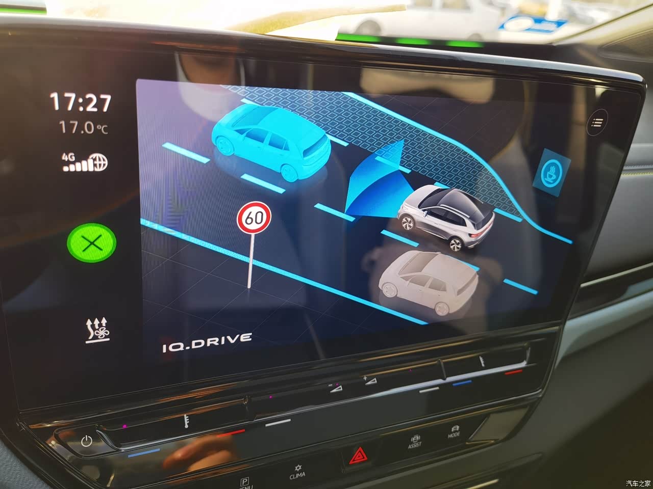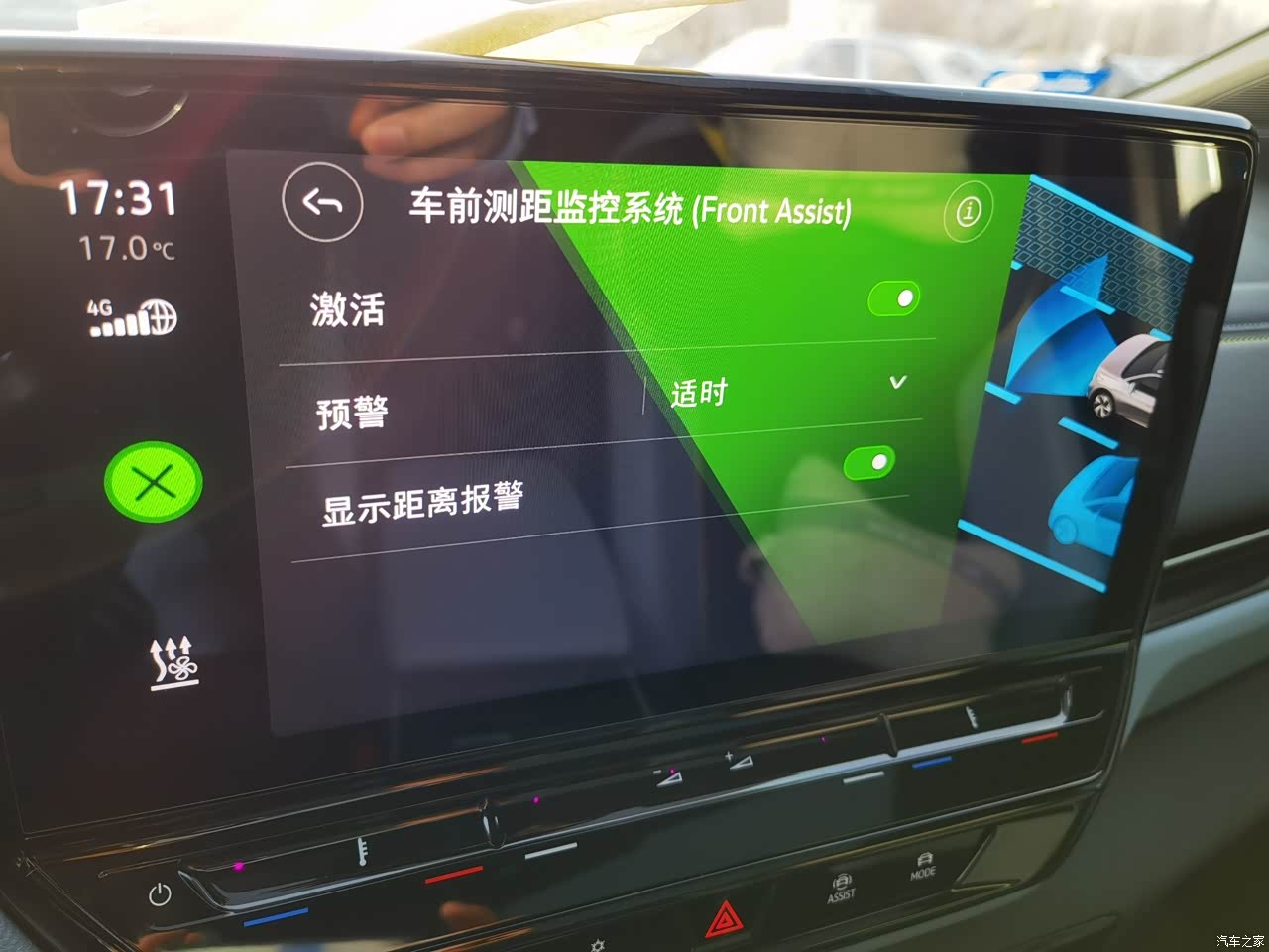 距离前车较近时仪表盘会先出现白色的小标志提醒,如果预判到危急,仪表盘和前挡风玻璃下的光语灯带再次提醒并且自动刹车,挺智能的。