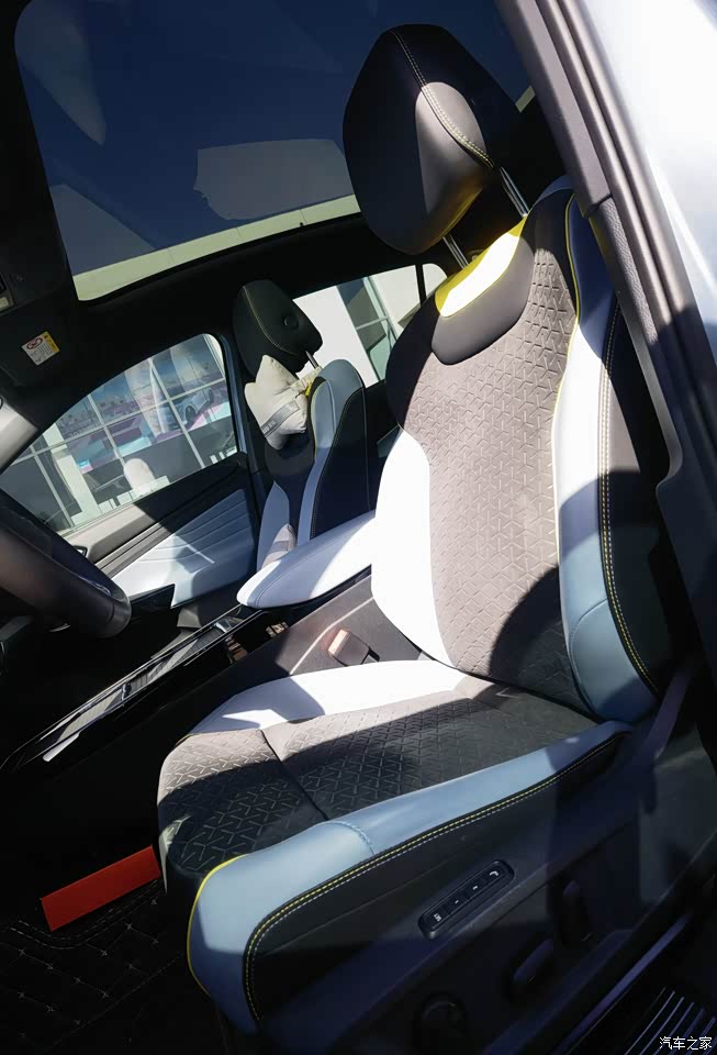 座椅的中间部分采用深灰色翻毛皮材质,摸上去很舒服,冬天不感觉凉,夏天也不感觉烫! 背面和侧边是皮质,虽然摸上去不像是真皮,但丝毫没有异味。 车内玻璃下沿和中控台的前半部分都是软包材质,还有锋线装饰,看起来比较上档次。