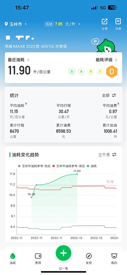 我是上下班通勤多,所以综合油耗11.2,这么重的车,反正我非常满意!