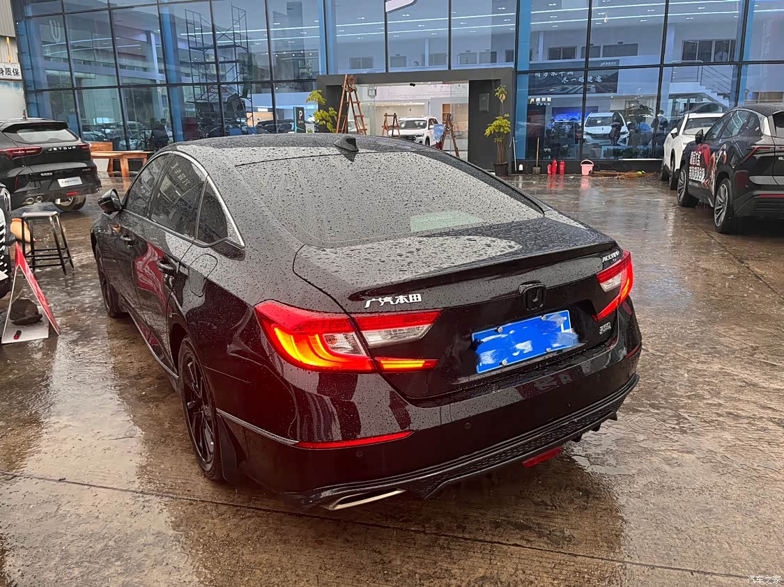 雅阁的尾部是一个溜背的造型,加上有一个鲨鱼鳍的一个效果,看得非常运动十足,两边C字型的尾灯配合单边两侧排气,那运动感瞬间上来了,很是不错。