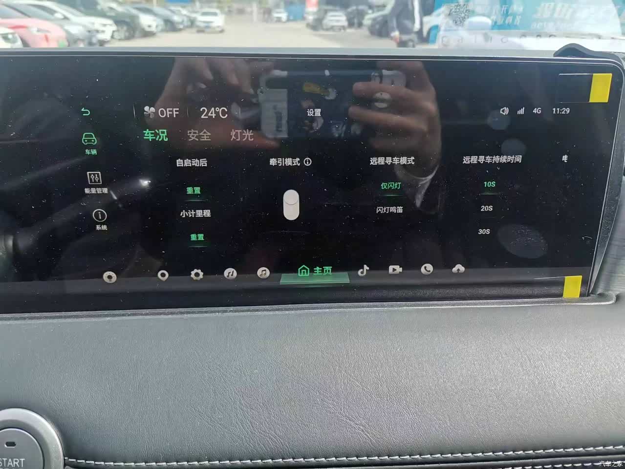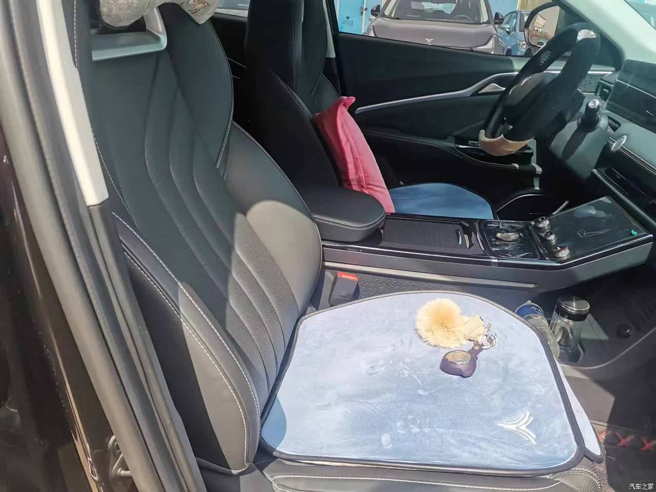 整体内饰色彩是黑色内饰,皮质软包,用手摸着软乎,不用担心感觉到寒冷。有异味做一次除甲醛处理,异味都能先出。