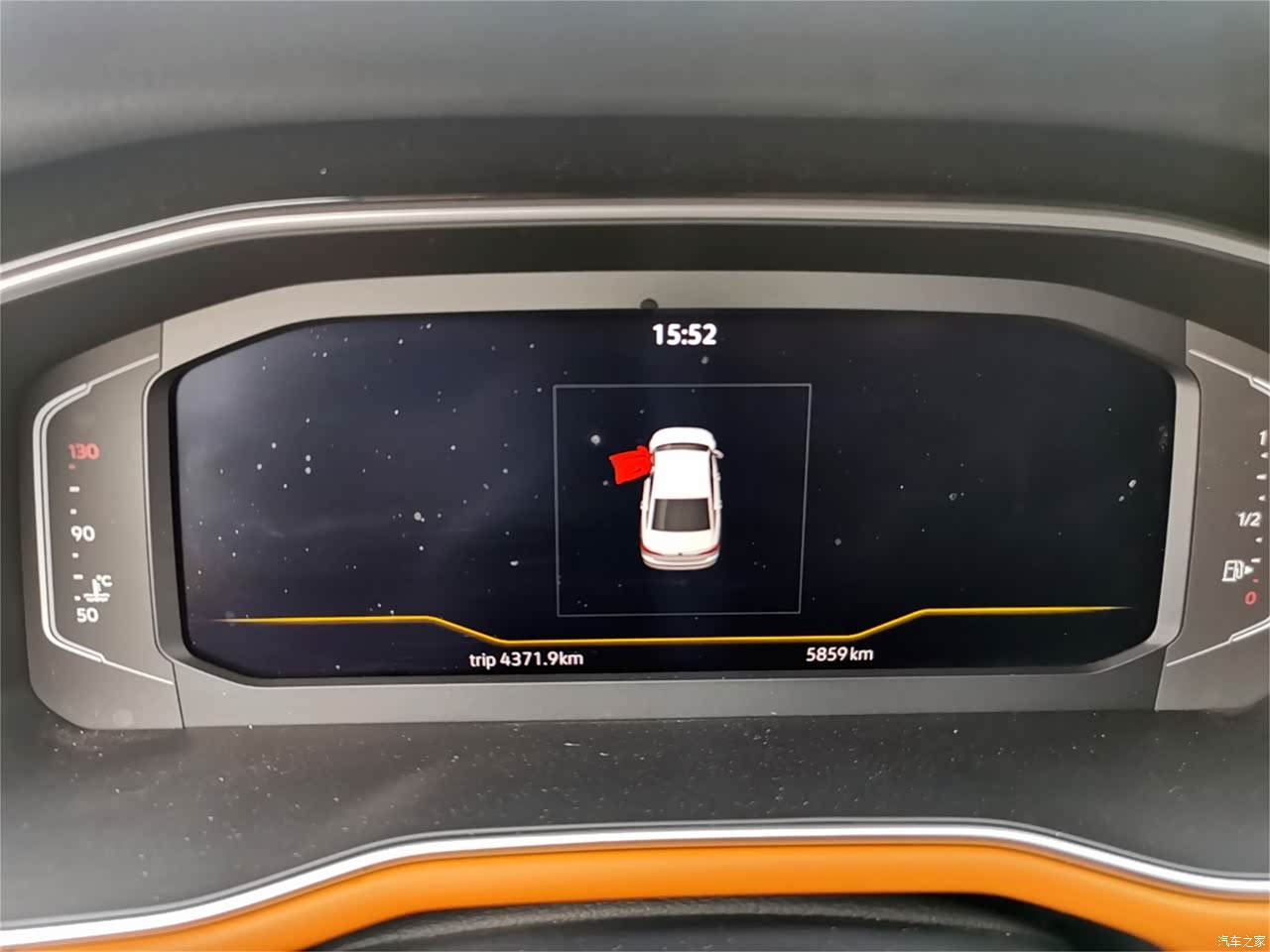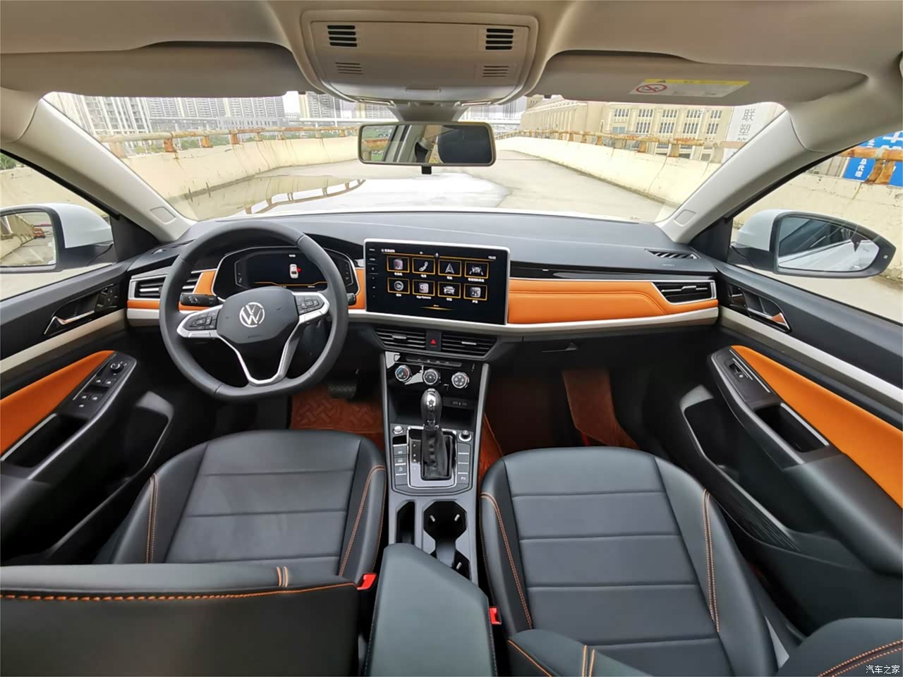 车内也是大众最新的设计风格,全液晶仪表盘加上12寸的中控屏,还有橙色的皮质包裹,显得很年轻时尚。