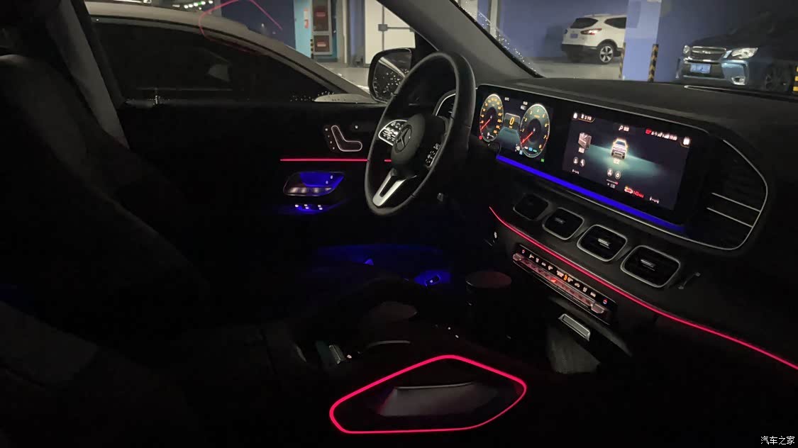 内饰这块奔驰真的拿捏的死死的,氛围灯嘎嘎有效果,我老婆开完保时捷卡宴后还是喜欢奔驰内饰,就能侧面说明一些问题。座椅舒适,家里小朋友坐到X5里就喊不舒服,也是我没有选择X5的一个重要原因,但这车竟然是仿皮,还没有通风我也是醉了,至于这么小气嘛!!空调制冷有点慢,不知道是我开的风速太小还是啥,后期再看看。