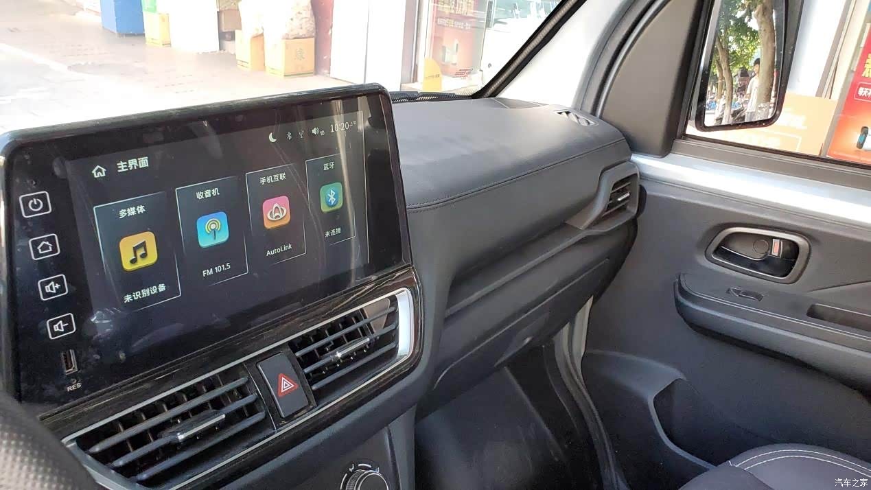 内饰设计比较简约,大大的仪表盘、三幅式方向盘、旋钮空调、机械挡把、机械手刹,要是不看外观,车内看起来还挺像一台轿车的内饰,实用、也耐看。还有一块悬浮式中控,有一点点科技感。