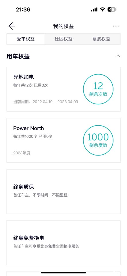 终身质保,终身免费换电,每年12次免费异地加电权益,物超所值!