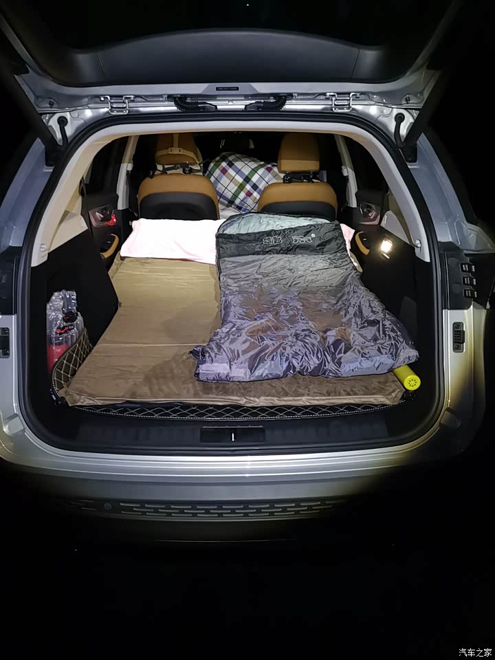后备箱空间非常大,放个轮椅都还富裕,后排座椅靠背放倒后,尾箱就变成了一个超大的双人床,里面平躺睡两个大人都不挤,腿都能伸直。
